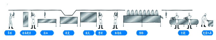 從工藝流程上來分,鴨的屠宰工藝包括:吊掛、致昏、放血、燙毛、打毛、三次浸臘、拔鴨舌、拔小毛、驗毛、掏膛、切爪、內(nèi)外清洗工作、預(yù)冷等步驟。